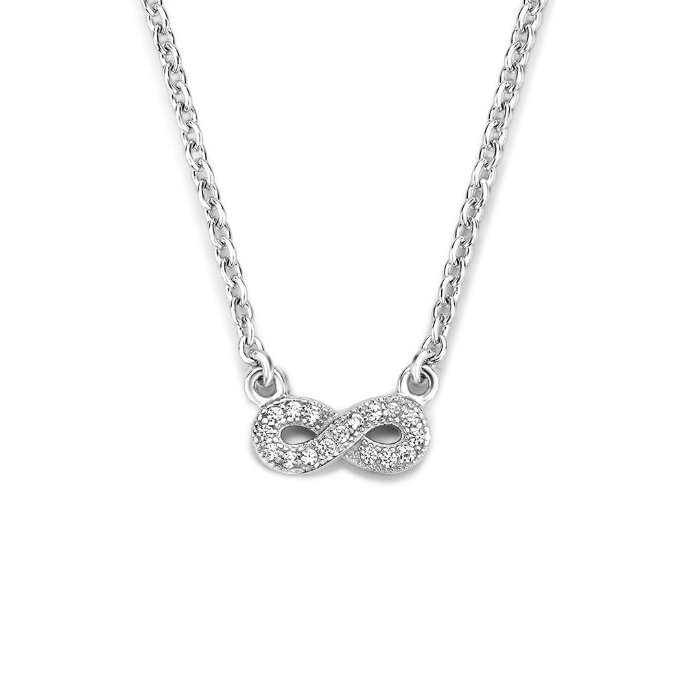 Infinity, the concept of something that is unlimited, commonly used as an expression of endless love or hope. This 925 silver necklace makes for a great gift for friends or your significant other. It features an infinity symbol pendant, decorated with stunning white zirconia gems set in a in a surface prong setting. This sterling silver necklace has a length of 40 cm that is adjustable by 5 cm.